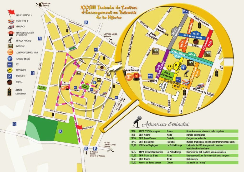 A les 11’30 hores comencen les activitats matinals. Hi haurà exposicions, animacions a peu de carrer, actuacions d’entaulat i activitats de diferent mena, que es distribueixen en diferents espais. Estan programats uns 130 tallers escolars i paradetes, una desena d’actuacions, balls populars, cançons en valencià, música tradicional valenciana, ball modern amb acrobàcies, representacions, actuacions de ‘funky’, partides de pilota valenciana, castells inflables, danses tradicionals, muixeranga, bosc d’aforismes fusterians, mascletà de globus.., entre altres activitats organitzades pels centres educatius i associacions culturals de Rafelguaraf, Carcaixent, Castelló de la Ribera, Carlet, Sueca, Alzira, Catadau, Corbera, Montserrat, Cullera, Favara, Guadassuar, la Pobla Llarga, Llombai, Torís, Manuel, Algemesí, Benifaió, Riola, Tavernes Blanques, Sollana, Alcàntera de Xúquer, Algemesí, l’Alcúdia, Montroi, Alginet, Almussafes, Beneixida, Alfarb, Alberic…