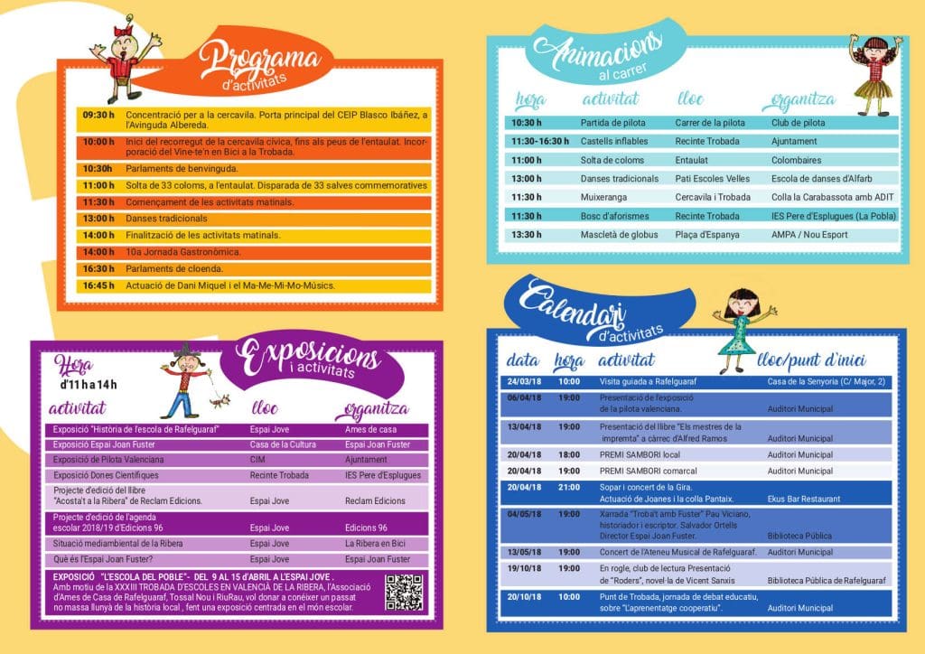 A les 9’30 hores, els centres educatius que participen en la Trobada d’Escoles en Valencià de la Ribera es concentraran per a la cercavila davant la porta principal de l’escola Blasco Ibáñez de Rafelguaraf (avinguda de l’Albereda). A les 10 hores s’iniciarà el recorregut de la cercavila cívica, que acabarà a l’escenari de la Trobada. Des de diferents pobles de la Ribera arribaran sobre rodes totes les persones que se sumen a la iniciativa ‘Vine-te’n en Bici a la Trobada’. Mitja hora més tard, tindran lloc els parlaments de benvinguda i, després, vora les 11 hores, es dispararan 33 salves i 33 coloms amb motiu de la XXXIIIa Trobada de la Ribera.