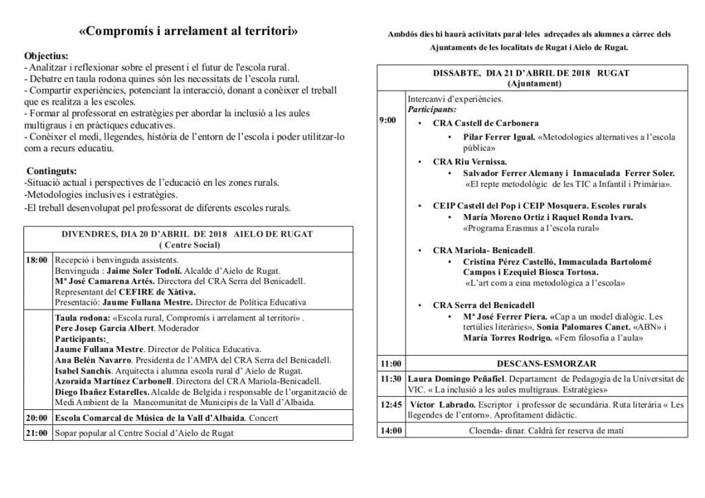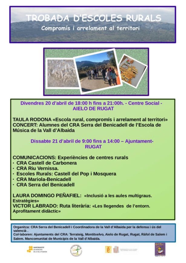 Aielo de Rugat i Rugat desenvoluparan les jornades «Compromís i arrelament al territori», que s’emmarquen en la I Trobada d’Escoles Rurals, organitzada per la Coordinadora de la Vall d’Albaida per la Defensa i Ús del Valencià i el CRA Serra del Benicadell els dies 20 i 21 d’abril. Aquesta activitat forma part de l’agenda d’actes que es desenvolupen amb motiu de la XXXIa Trobada d’Escoles en Valencià de la Vall d’Albaida.
