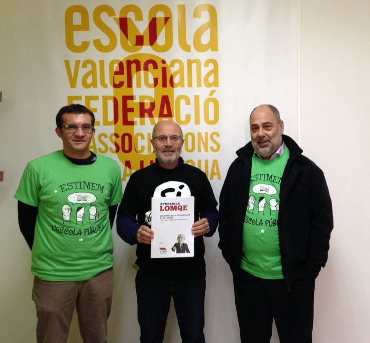 Després del recent fracàs del Pacte Educatiu, és necessari agilitar els treballs per a la derogació de la LOMQE, implementant primer totes aquelles mesures que paralitzen els aspectes més negatius d’aquesta. Per això, és imprescindible recuperar el diàleg amb els sindicats i la comunitat educativa, menystinguts constantment per l’executiu de Mariano Rajoy. L’escola pública ha de ser l’eix vertebrador de l’ensenyament, i per això és imprescindible que siga igualitària, compensadora de les desigualtats, democràtica, laica, coeducadora, respectuosa amb les diferents llengües i cultures de l’estat, i lliure dels interessos privatitzadors i ideològics de les elits conservadores.