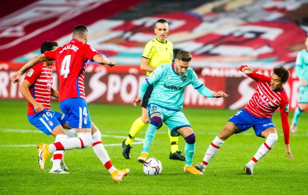 El Levante UD va sumar un punt en l’estadi Nou Los Cármenes enfront del Granada (1-1). El conjunt granota va aconseguir igualar el marcador per mitjà de Vezo després que els nassarites s’avançaren abans que el partit complira els seus primers 10 minuts de joc. Res més anotar el rival, va ser expulsat Gonalons per roja directa i va arribar el punt del portugués però el marcador no es va moure més malgrat que els de Paco López van gaudir de les seues oportunitats.