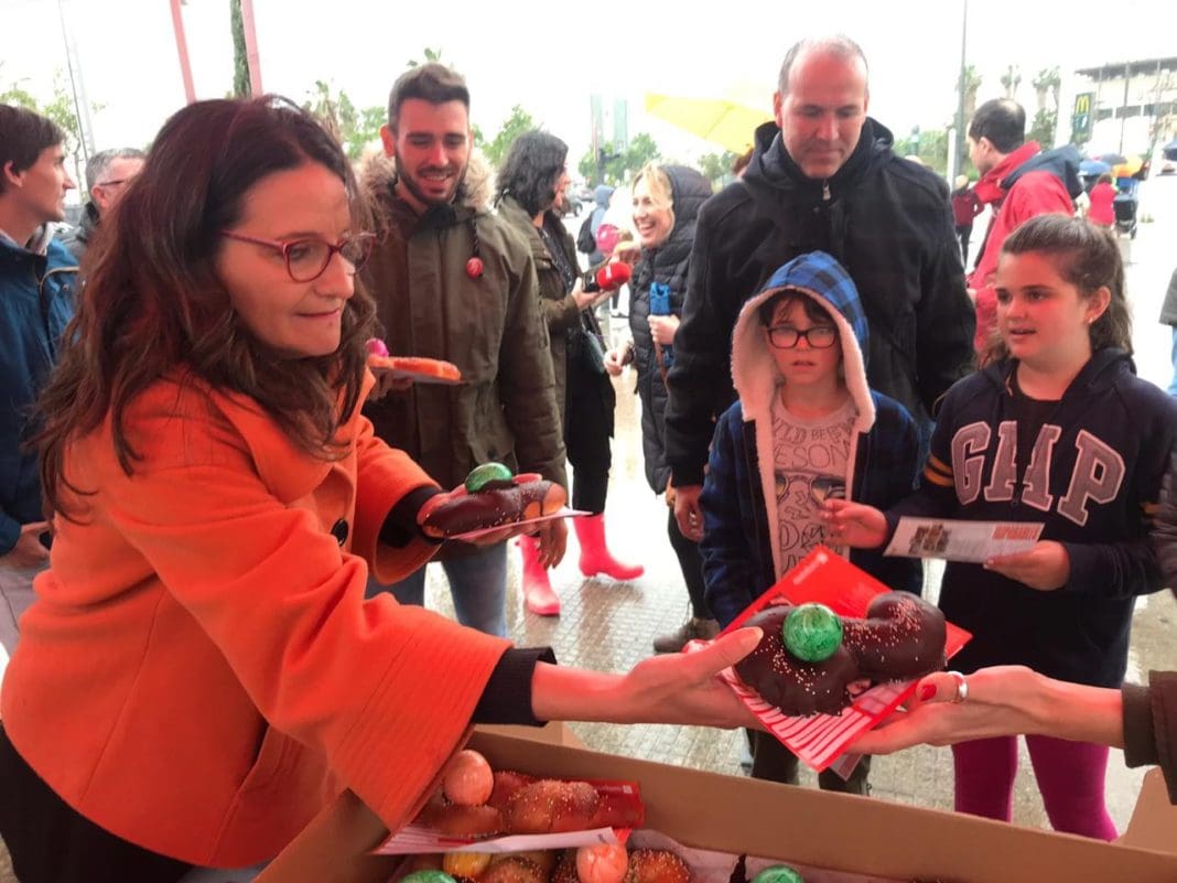 La candidata de Compromís a la Presidència de la Generalitat, Mónica Oltra, el candidat a Les Corts Fran Ferri i la candidata al Congrés Isaura Navarro han participat al voltant de la Ciutat de Les Arts i les Ciències de València en un repartiment de mones de pasqua i material de campanya organitzat per la coalició.