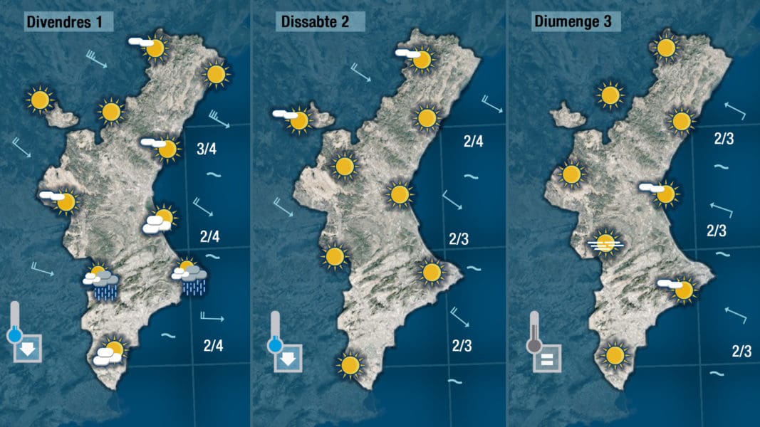 Daremos la bienvenida con ganas de cambios…pero con una rápida ojeada al mapa comprobaremos que de cambios pocos. Bajarán las temperaturas y hasta sábado por la mañana se dejarán sentir el mistral y el poniente para quedar el viento más calmado la segunda parte del fin de semana.