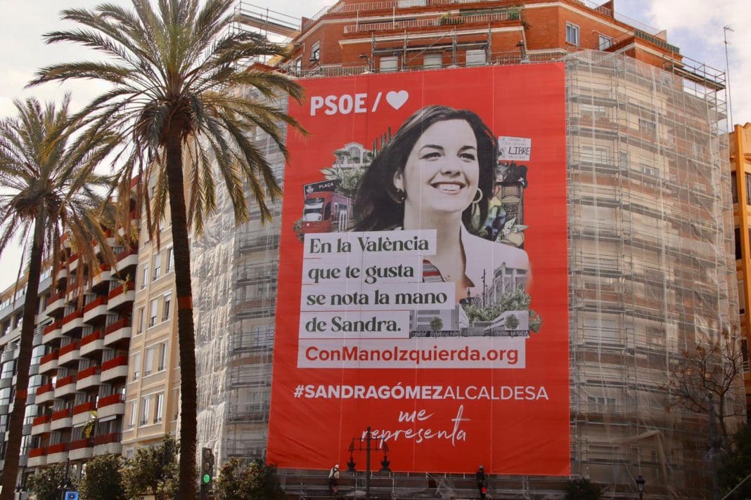 València ha amanecido este jueves con dos lonas gigantes que avecinan que la campaña electoral ya se ha empezado a jugar en la capital, aunque todavía falten tres meses para los comicios municipales y autonómicos. Tanto la candidata a la Alcaldía del Partido Popular, Maria José Catalá, como la cabeza de lista del PSPV-PSOE, Sandra Gómez, han desplegado una lona de considerables metros en dos grandes calles, aprovechando también la llegada de Fallas y los miles de turistas que visitarán la ciudad.