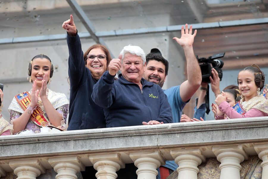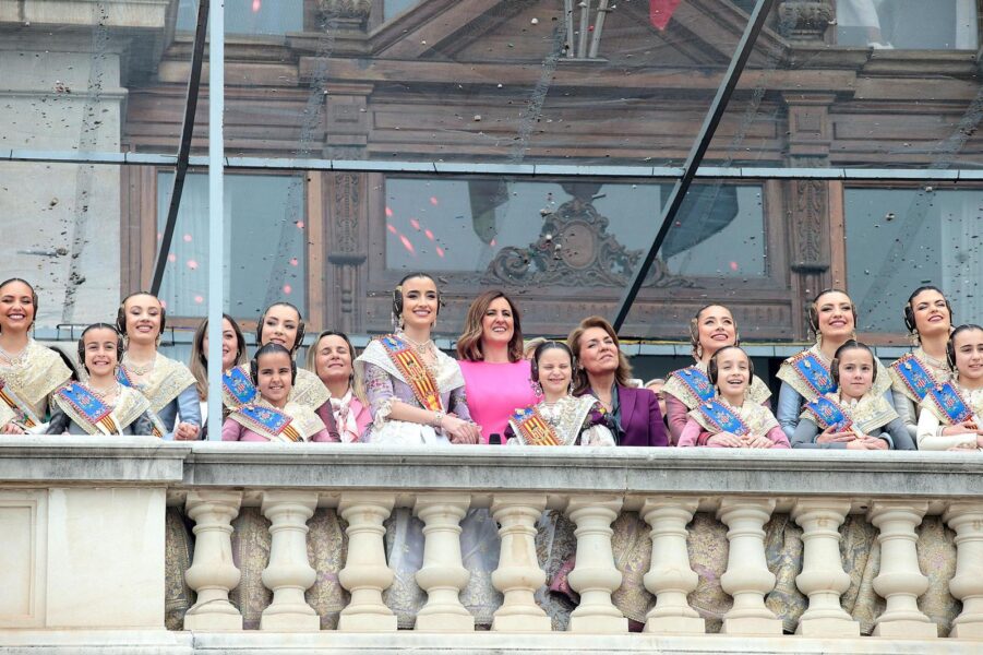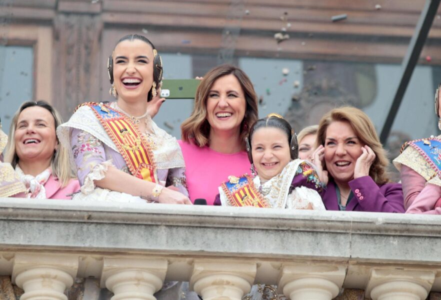Desde el balcón del Ayuntamiento siguieron el espectáculo la vicepresidenta del Consell, Susana Camarero, con chaqueta morada, la alcaldesa de València, María José Català, y la delegada del Gobierno en la Comunitat Valenciana, Pilar Bernabé. La presencia institucional y el apoyo del público enmarcaron un disparo que unió color, sonido y una clara referencia al 8M en pleno corazón de las Fallas.