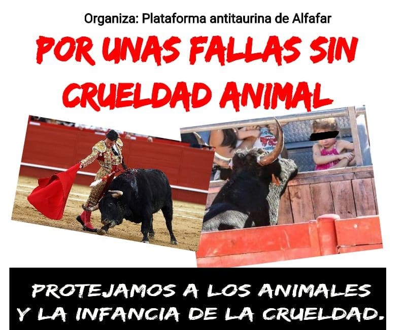 Desde la plataforma antitaurina de Alfafar han convocado una concentración este domingo 13 de marzo bajo el lema «Fallas sin sangre/infancia sin violencia». Los integrantes de la asociación animan a la población a que asista a las 16:30 cerca de la plaza de toros de Valencia y concretamente en frente de la Renfe.