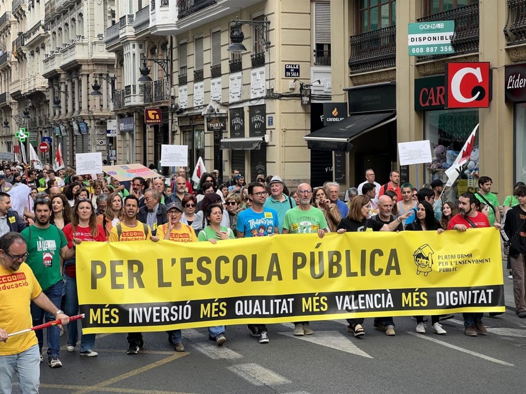 Una manifestación convocada por la Plataforma en Defensa de l’Ensenyament Públic ha recorrido este jueves las calles del centro de València, coincidiendo con la huelga educativa convocada esta jornada en la Comunitat Valenciana para protestar contra las políticas del PP y Vox –partidos de gobierno en esta autonomía–, para reivindicar una escuela «pública, de calidad y en valenciano» y reclamar la Consell que paralice la futura ley de libertad educativa por ser, a su juicio, «regresiva» y por «atentar contra los derechos de la comunidad educativa».