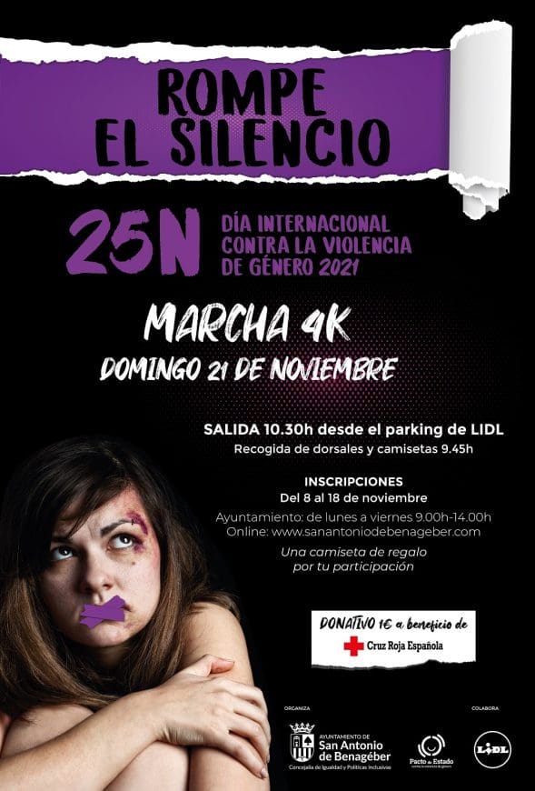 El próximo domingo 21 de noviembre tendrá lugar una marcha solidaria con motivo del Día Internacional contra la Violencia de Género, que se conmemora cada 25 de noviembre. La marcha 4K por el municipio se enmarca en la programación de actos conmemorativos, y los beneficios obtenidos con los donativos (1 euro) se destinarán a Cruz Roja Española.