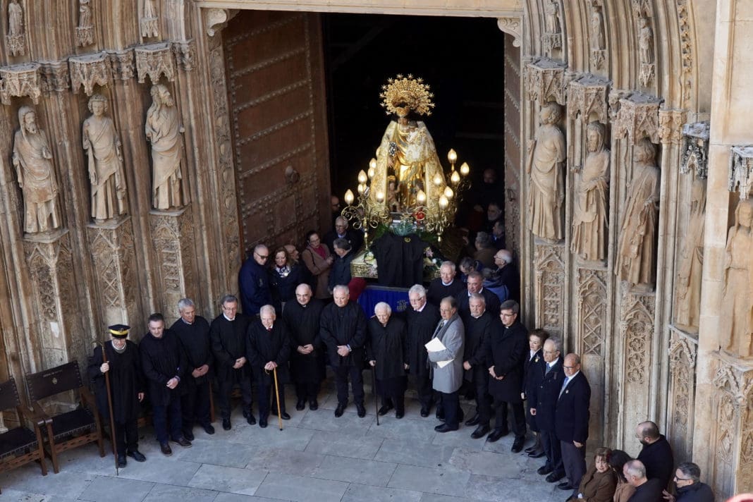 A las doce del mediodía, cuando sonaban las campanas del Micalet, se ha abierto la Puerta de los Apóstoles de la Seo donde la imagen peregrina de la Virgen esperaba el comienzo de la sesión judicial, y ha sido recibida con calurosos aplausos, en una mañana gélida, del numeroso público presente y con una lluvia de pétalos desde los balcones de la vecina Casa Vestuario, sede del Tribunal de las Aguas.