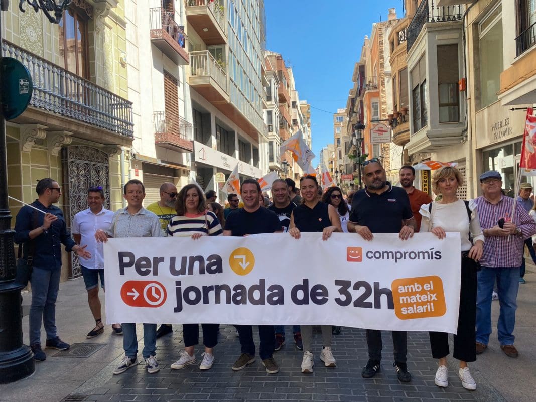 Marzà, que ha participado esta mañana en la Manifestación del 1 de Mayo de Castelló junto a otros miembros de su candidatura, como Verònica Ruiz, Mònica Àlvaro y Quique Castelló, y representantes de Compromís de Castelló, como Ignasi Garcia, Vera Bou, Pau Sancho, Francesc Mezquita numerosos municipios como Borriana, Almenara, Benicàssim, tras una pancarta por las “32 horas de jornada, sin pérdida salarial, ha detallado que “Compromís impulsará más medidas para implantar la jornada laboral de 32 horas sin pérdida salarial a través de programas que contemplen incentivos económicos para las empresas, así como medidas para acompañamiento de la medida, de formación…”.