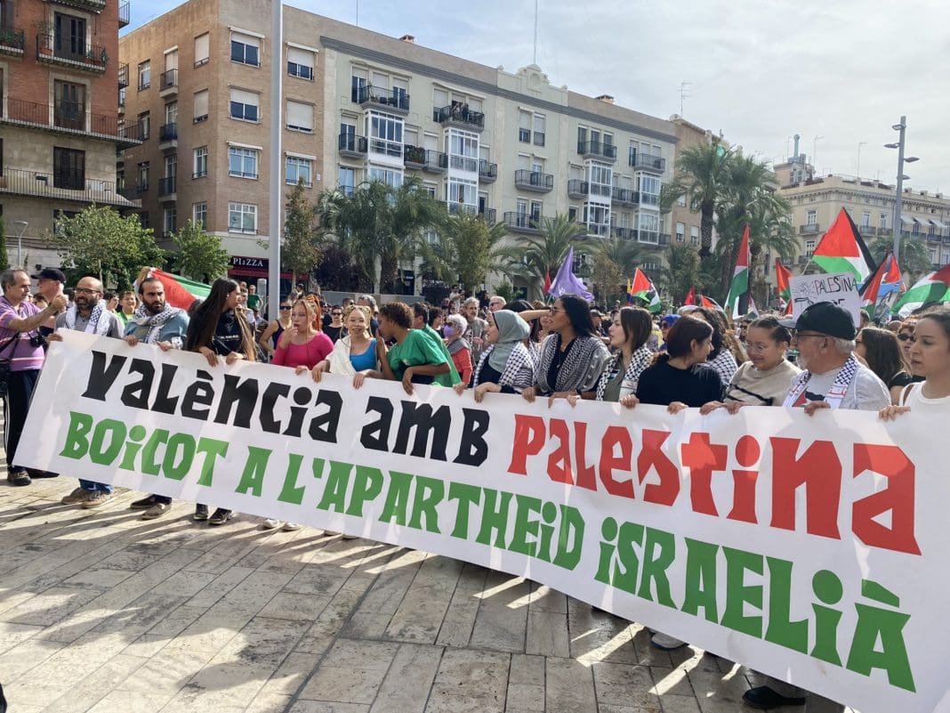 Más de un millar de personas se ha congregado este domingo al mediodía en València en solidaridad con Palestina y para pedir el fin de la ocupación de Gaza. Bajo el lema «València amb Palestina. Boicot a l’apartheid israelià», se han concentrado en la Plaza de la Reina desde donde se ha iniciado la manifestación por las calles del centro de la ciudad.