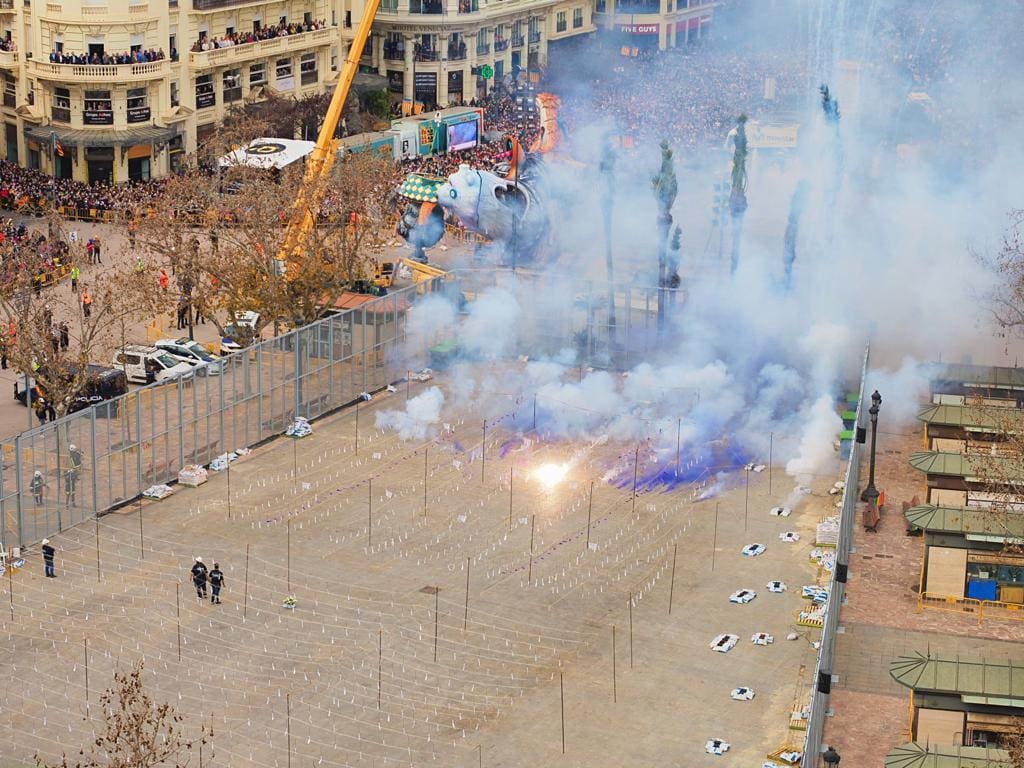 El espectáculo de fuegos ha estado protagonizado hoy por la Pirotecnia Martí, empresa creada hace más de 150 años, cuya propietaria Reyes Martí, una mujer pionera en un sector, lleva desde el año 2004 disparando el 8 de marzo. En la mascletà de hoy, Reyes ha hecho un guiño a la fiesta a través del color morado, el humo y los efectos. Una disparà contundente, compuesta de cinco fuegos terrestres y un bombardeo final de 30 segundos