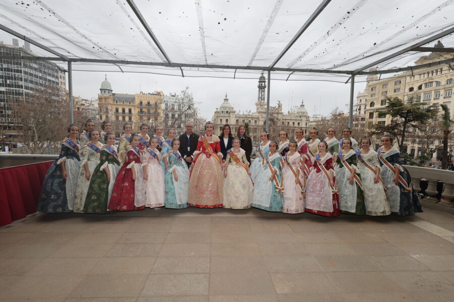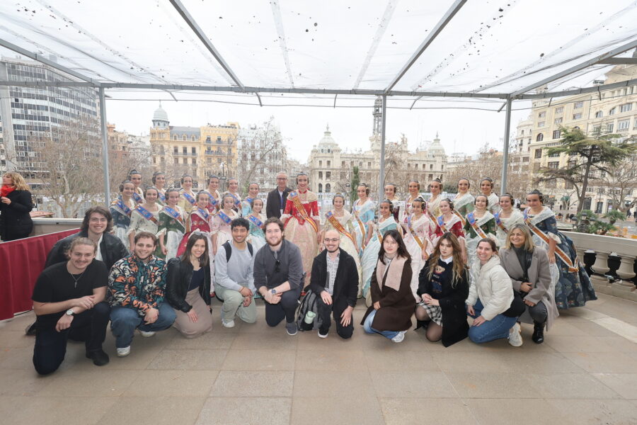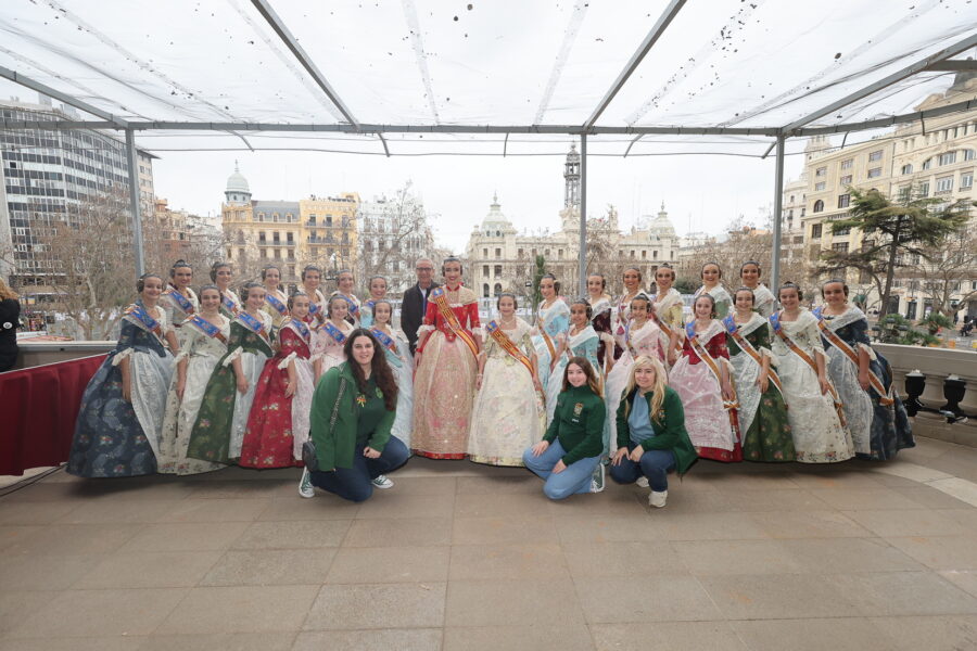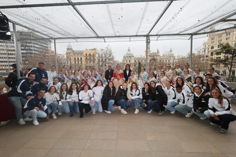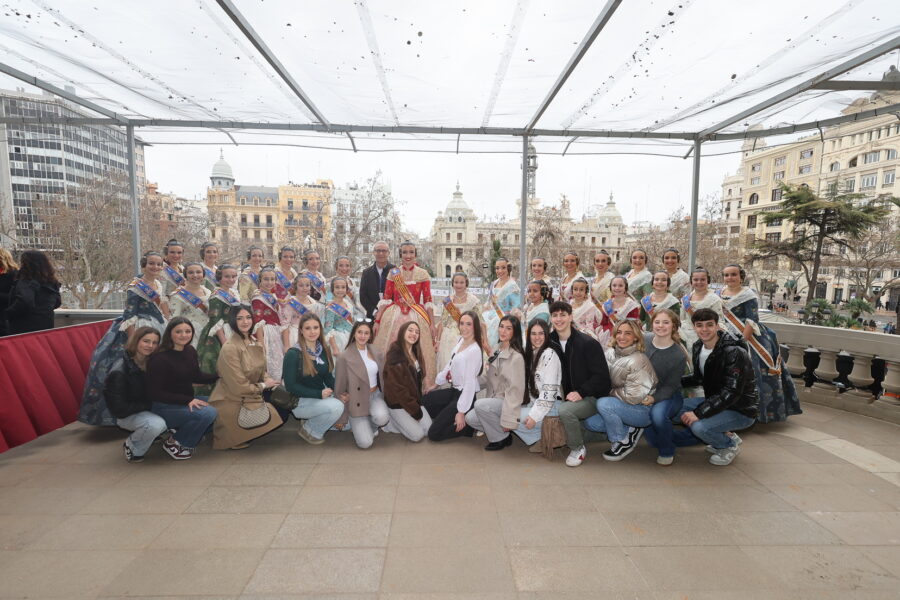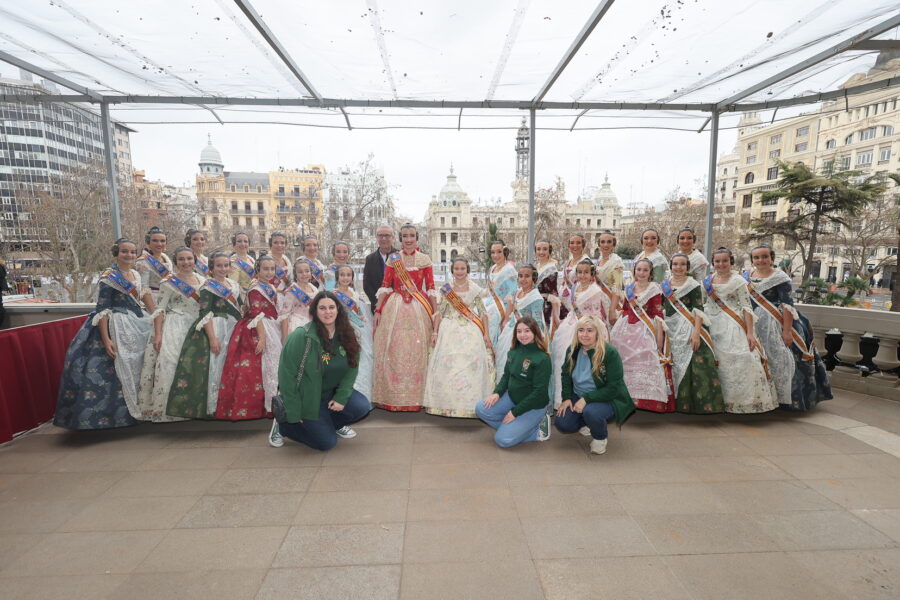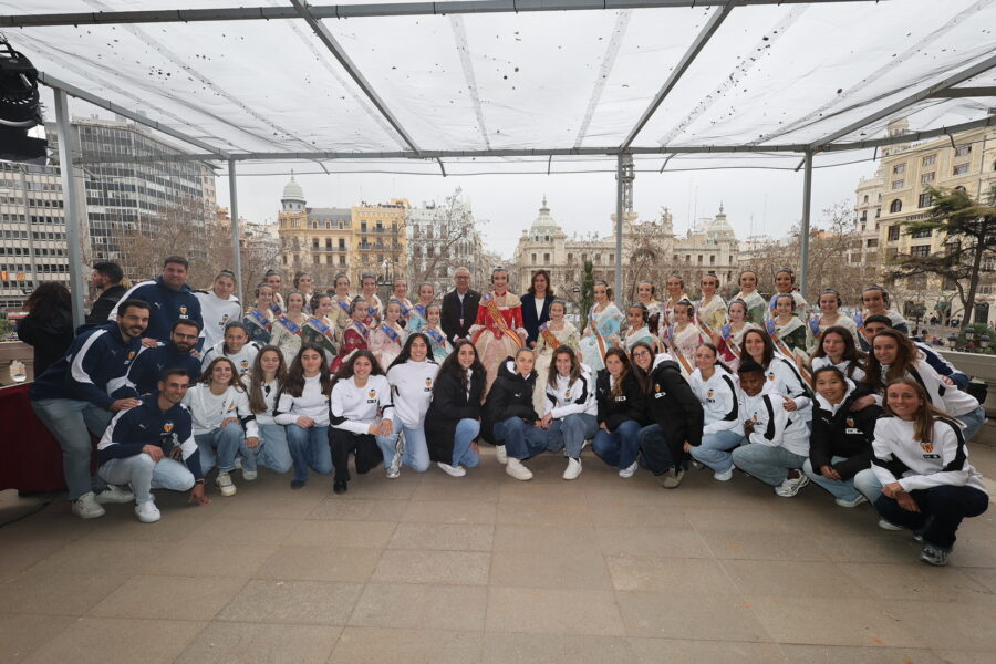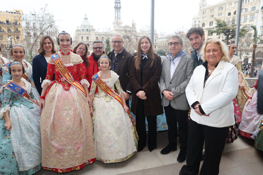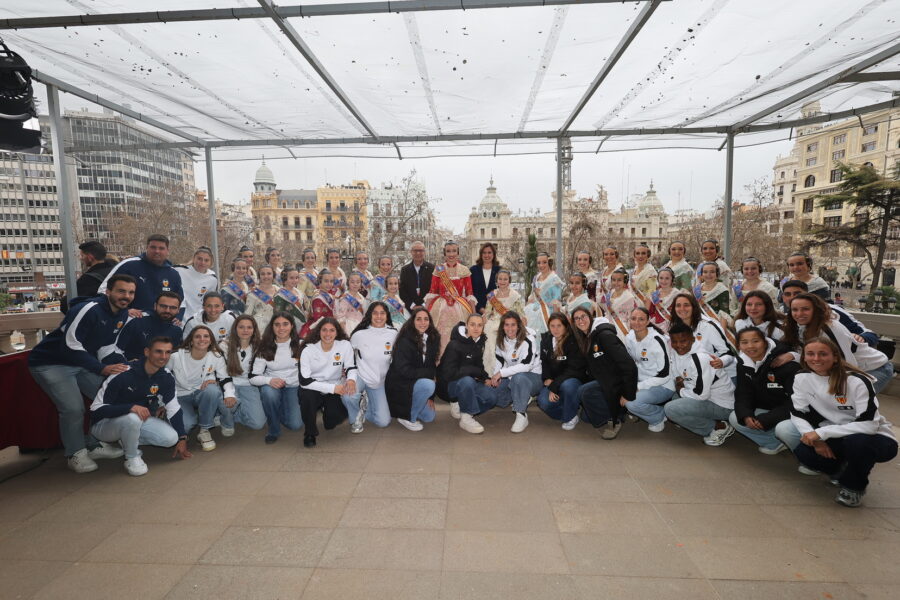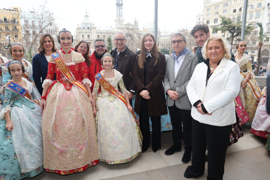 En el balcón de la Casa Consistorial han asistido como invitadas la mantenedora de la fallera mayor infantil, Cuchita Lluch, así como representantes del Binomio Universidad-Ciudad, el Club de Gimnasia Aeróbica, el Valencia Club de Fútbol Femenino, Miss Valencia y Mr- RNB Valencia 2026, además de integrantes de Berklee València.