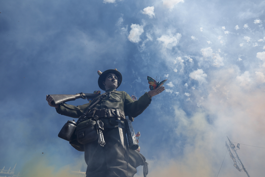 El disparo, celebrado a las 14.00 horas en la plaza de L’Ajuntament, ha vuelto a convertir el centro de la ciudad en uno de los grandes escenarios de las Fallas. La propuesta de la firma valenciana ha girado en torno a la pólvora como eje de la celebración y a la identidad fallera como hilo conductor del montaje.