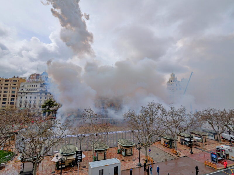 La lluvia obliga a disparar solo parte de la mascletà de Fallas en la plaza del Ayuntamiento de València
