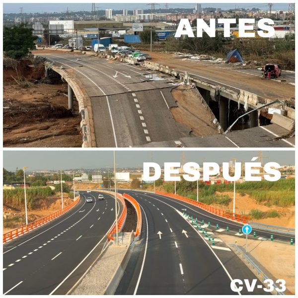 La puesta en servicio integral de los cuatros carriles de la CV-33 era una prioridad para el Consell que, en poco más de diez días después de la riada, el 12 de noviembre, fue reabierta parcialmente al tráfico.