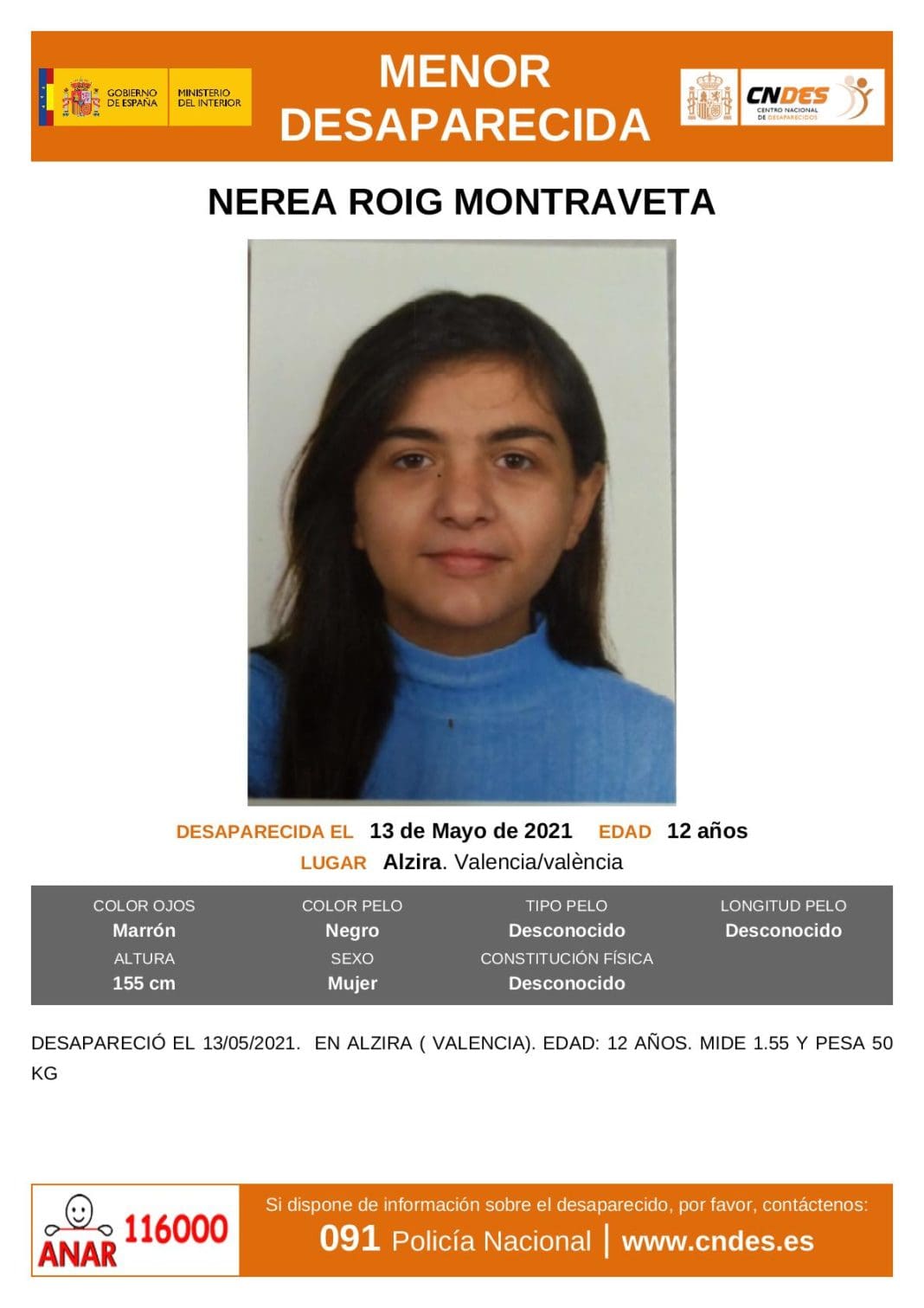 Nerea Roig Montraveta tiene 12 años, mide 1,55 metros, es de complexión delgada, tiene los ojos marrones y el pelo castaño,