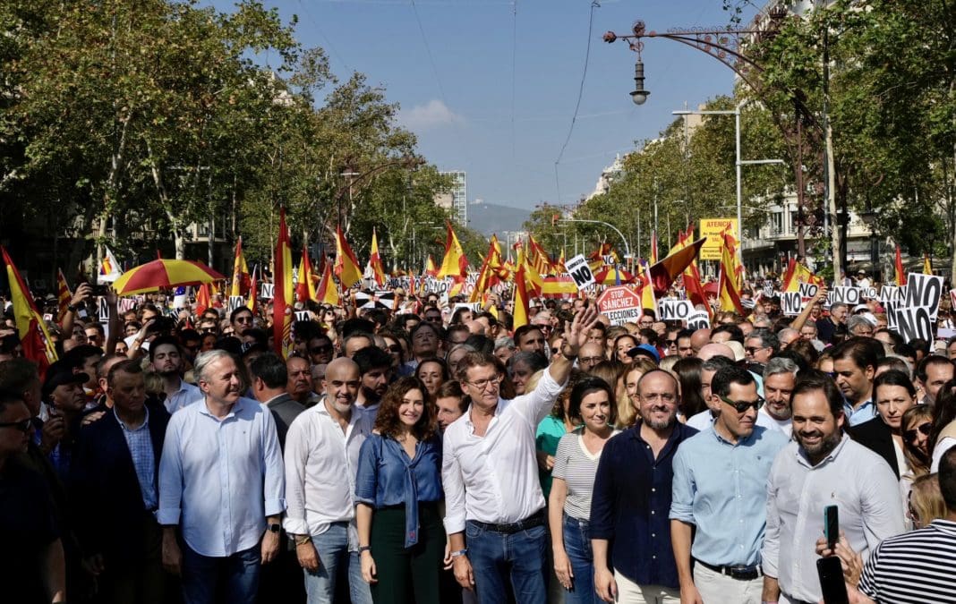 El popular Alberto Núñez Feijóo ha señalado que están en Barcelona «para manifestar nuestro compromiso inequívoco con una sociedad de ciudadanos libres e iguales» y ha añadido que respaldan a «todos los catalanes que han sido abandonados por el independentismo y por el socialismo».