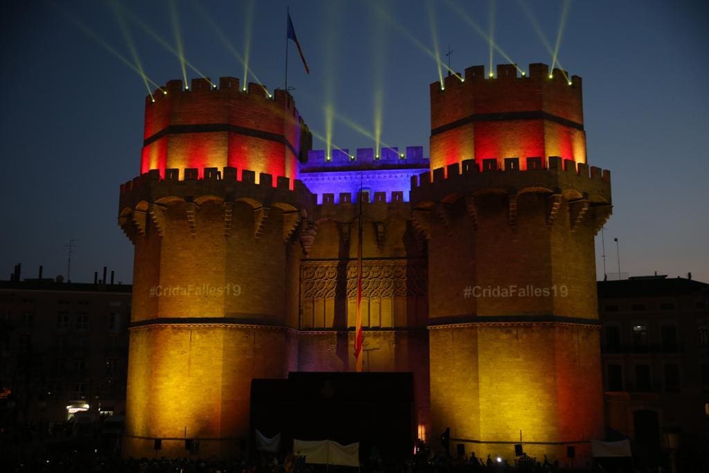 l dia ha arrancat a les 18.30 hores amb un espectacle d’animació de carrer, i hora i mitja després ha començat la Crida a les Torres de Serrans. Després de l’espectacle de llum, so i color a càrrec de FAM Teatre titulat ‘Batecs de falla’ projectat sobre les torres, l’alcalde Joan Ribó ha oferit un discurs, per a després entregar simbòlicament les claus de la ciutat a les falleres majors de València.