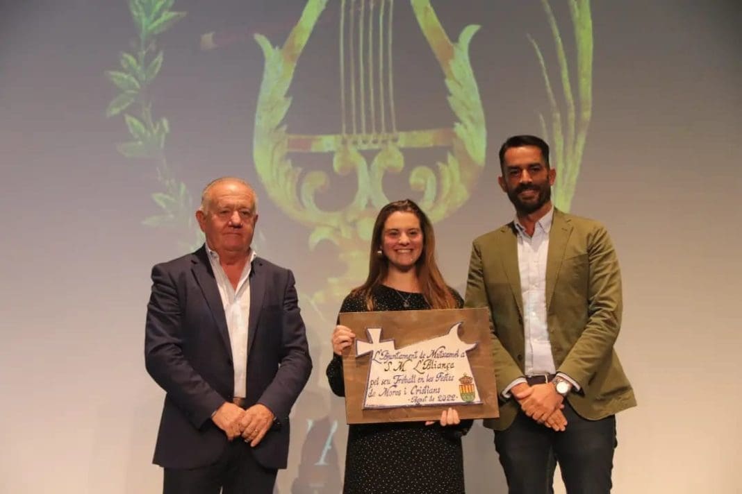 En segundo lugar, se homenajeó a la Societat Musical L’Aliança. Después fue el turno de todos los participantes en las Embajadas de Moros y Cristianos de Mutxamel, Els Ambaixadors, como son Francisco Alberola, Sofía Aracil, Vicente Martínez Ripoll, Alberto Segura Sala, Jorge Olivares Blasco, Francisco Javier Martínez Corbalan, Cristina Sala Soler, Paco Blázquez Ayela, Fernando Ruzafa Amat, Isidoro Santamaría Ivorra, José Jaime Santamaria, Luis Rubio Martínez y Juan Campos Gómez. Alguno de ellos no pudo asistir al acto, aunque recogieron la distinción familiares cercanos.