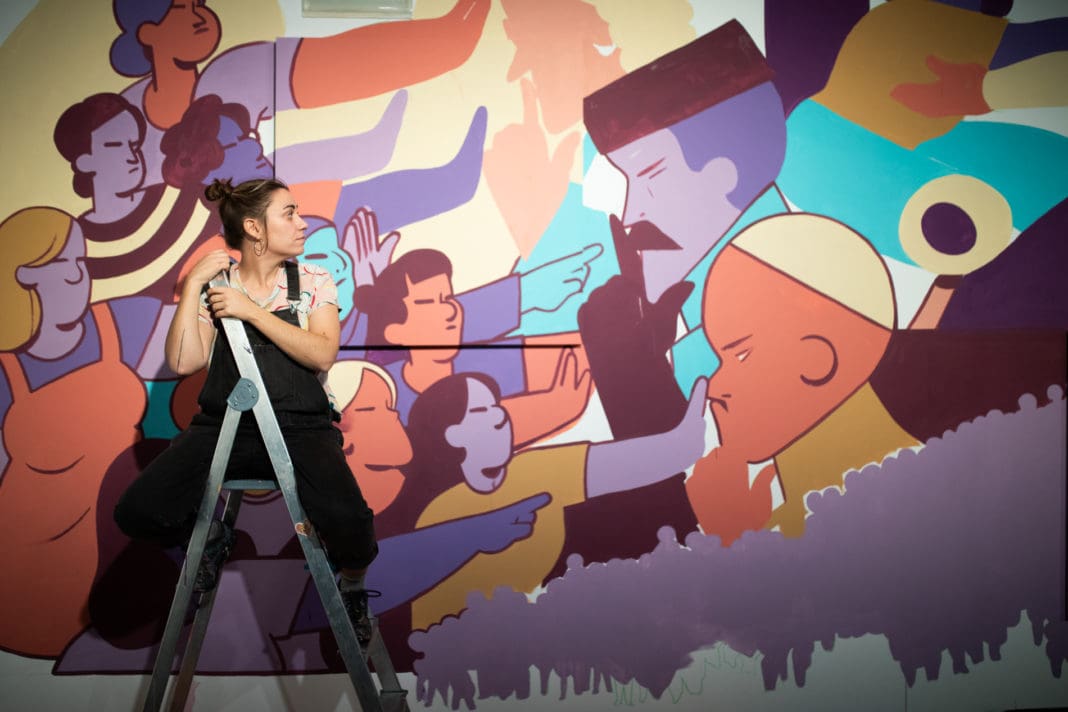¿Qué entendemos por violencia machista?, ¿Desde dónde se vertebra la violencia hacia las mujeres?, ¿Cómo hemos sido capaces de llegar hasta aquí?, son algunas de las preguntas a través de las cuales se genera la base narrativa del mural ‘25 de Novembre. Contra totes les violències masclistes’”, apunta Galletamaria.