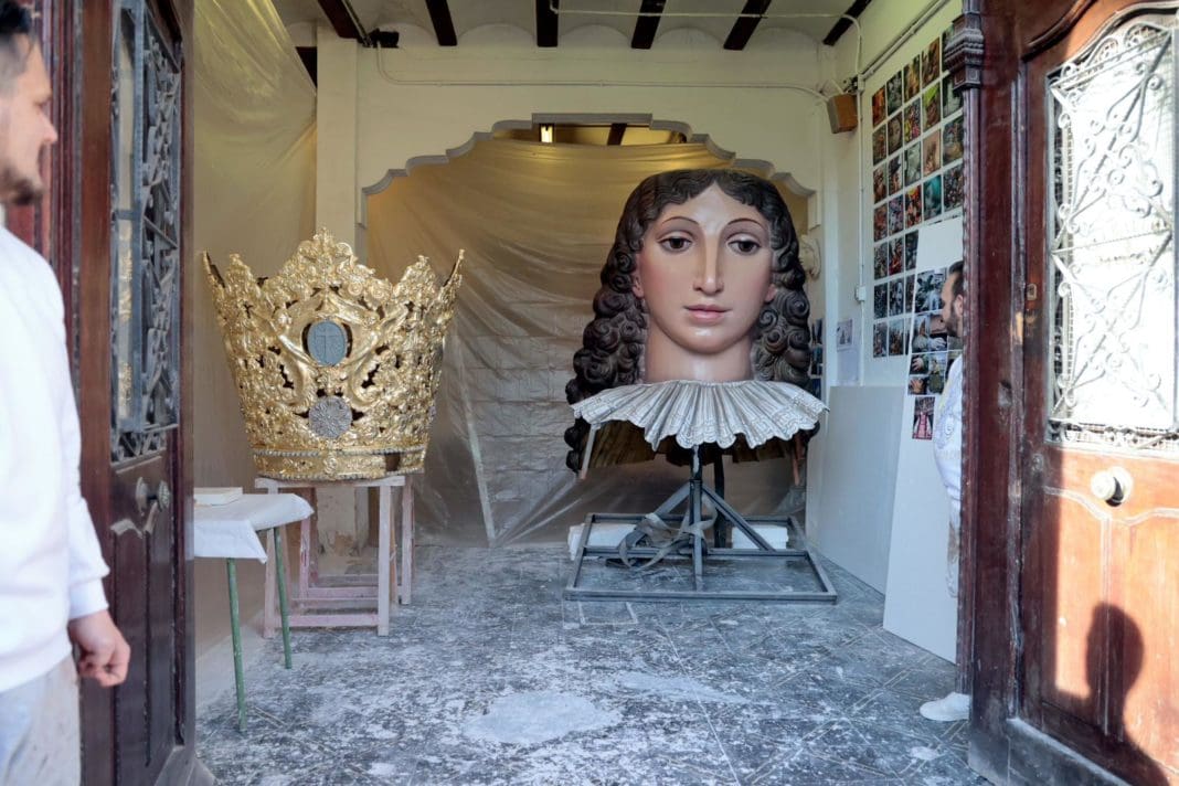 Todo listo para que el cadafal de la Mare de Déu vuelva a lucir con todo su esplendor en la Ofrenda tras la restauración que ha llevado a cabo el taller Ceballos y Sanabria y el de Alejandro Santalaulia. El trabajo ha consistido en la rehabilitación del conjunto escultórico figurativo de la Virgen, que en las últimas fallas presentaba un serie de grietas y desperfectos, así como de la estructura que sujeta la figura para mejorar su seguridad.