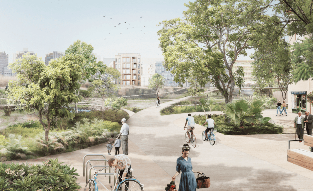 El proyecto no se limita a crear zonas verdes en las nuevas zonas, sino que propone “generar un espacio en zig-zag que forme cuñas verdes que se adentren en los barrios, especialmente en los barrios de la Creu Coberta y Malilla”, ha detallado Gómez. Un diseño que plantea además una diversidad de paisajes que reproducen masas forestales, espacios agrícolas, zonas verdes vinculadas al agua, y otras de carácter más urbano.