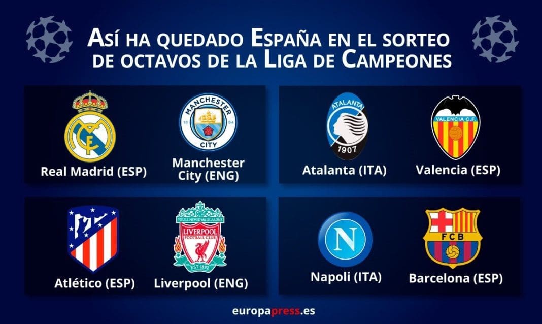 El Reial Madrid i l’Atlètic de Madrid no han tingut massa sort en el sorteig d’octaus de la Lliga de Campions i es mesuraran en esta ronda al Manchester City i al Liverpool, actual campió, mentre que els italians Nàpols i Atalanta seran els oponents del FC Barcelona i el Valencia.