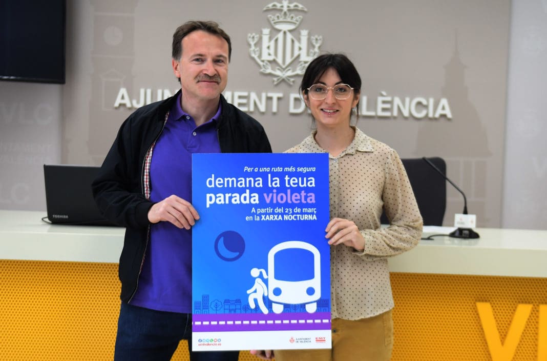 El pròxim 23 de març comença a funcionar de manera pilot el programa «Parades Violeta» de l’EMT, que oferirà la possibilitat que les dones usuàries de les línies nocturnes puguen sol·licitar una parada a demanda dins del recorregut de la línia, de manera que les deixe més pròximes a la seua destinació. Tal com han explicat este dimecres el regidor de Mobilitat Sostenible, Giuseppe Grezzi, i la regidora d’Igualtat, Lucía Beamud, la iniciativa pretén previndre possibles situacions de risc que posen en perill la integritat de les dones.