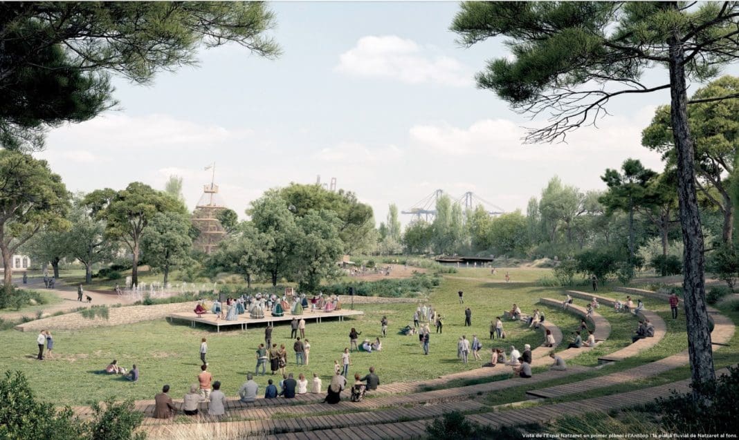 Un proyecto que unirá el tramo final del cauce del río con la fachada marítima y apuesta por recuperar la morfología original del río hasta el puente de Drassanes. Del mismo modo propone un bosque urbano “como el de la Rambleta”; incorpora una playa fluvial, una lámina de agua que recuerda a la playa de Natzaret, pero se descarta la conexión con el mar y que pueda utilizarse para el baño; y un «mini Gulliver», un espacio de juego a gran escala con un barco del naufragio de este aventurero.
