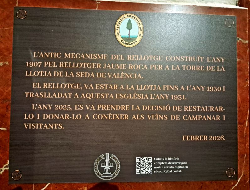 Al costat del mecanisme del rellotge s’ha col·locat a la paret una placa explicativa de la seua història, què inclou un codi QR amb què es pot accedir a la història completa del vell rellotge.
