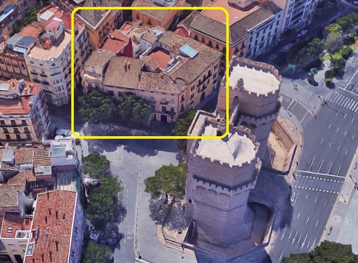 Hi adjunte a continuació una fotografia aèria que vos permetrà identificar amb facilitat de quina illa de cases vos estic parlant, què és just la més propera a la Porta dels Serrans: