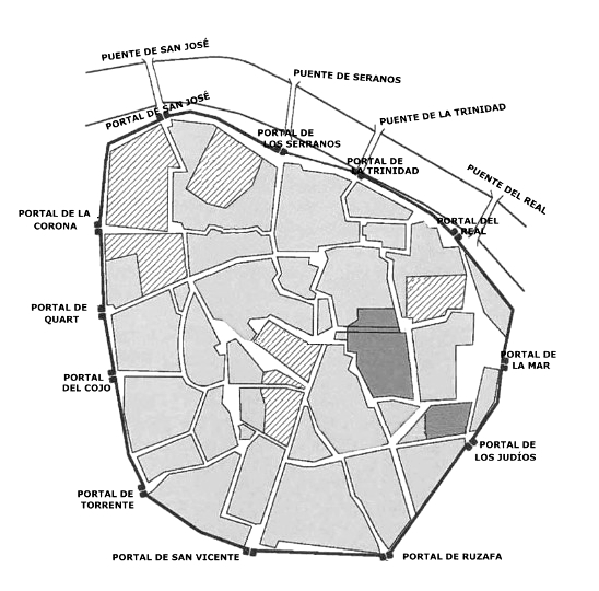 Van ser dotze els portals que es van obrir a la muralla per donar entrada als principals camins que arribaven a la ciutat. La muralla romana n’havia tingut quatre i la islàmica set. Dels dotze, n’hi havia 4 principals orientats aproximadament als quatre punts cardinals, què coincidien amb els principals camins d’accés a la ciutat. S’anomenaven “portals majors”: els de Serrans, del Mar, de Sant Vicent i de Quart. Els 8 restants es coneixien com a “portals xics”.