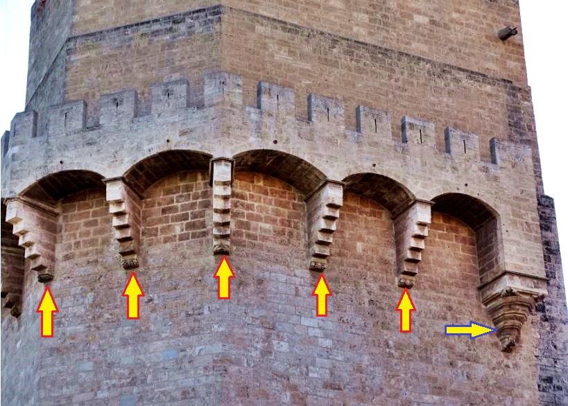 Però també la trobarem en el total de mènsules que formen part de la seua barbacana, és a dir, en els elements que sostenen la part superior de l’edifici. En concret són vint-i-sis, quatre d’elles de forma de piràmide invertida (les situades als extrems exteriors i flanquejant el cos central) i vint-i-dos més de forma esglaonada al llarg de les torrasses i el cos central.