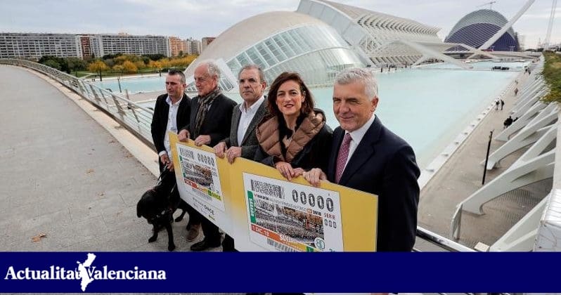 La directora de la Fundació Trinidad Alfonso, Elena Tejedor, el delegat de l'ONCE en la Comunitat Valenciana, Jose Manuel Pichel (dcha), presenten el cupó de l'ONCE dedicat a la marató València Trinidad Alfonso EDP. En la imatge al costat de Teixidor i Pichel l'esportista cec Juan Antonio Menor; el president de la SD Correcaminos, Paco Borao; i el director general de CACSA, Enrique Vidal. EFE