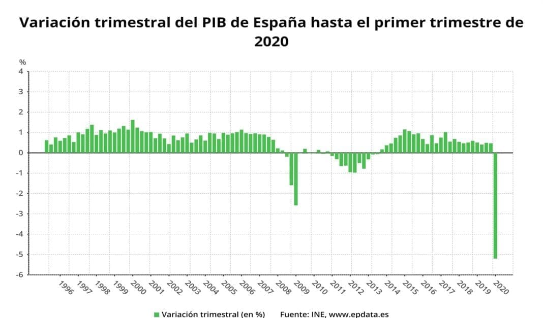L’economia espanyola va patir l’impacte del coronavirus durant el primer trimestre i va retrocedir un 5,2%, la caiguda trimestral més important de la sèrie històrica de l’Institut Nacional d’Estadística (INE), que arranca el 1970. Fins ara, la més pronunciada era del primer trimestre del 2009 (-2,6%).