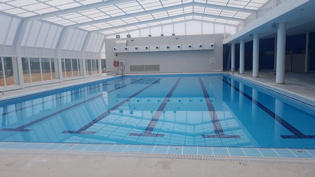 La nova edificació està constituïda per tres blocs diferenciats: la prolongació de la coberta vermella del poliesportiu, la coberta telescòpica automàtica de la piscina i un edifici d’instal·lacions on es troba la caldera per escalfar l’aigua de la piscina, així com el quadre elèctric o el sistema de depuració i cloració.