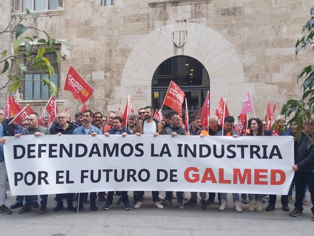 La plantilla de Thyssenkrupp Galmed, que este jueves celebra una jornada de huelga, ha participado en una concentración ante el Palau de la Generalitat, convocada por CCOO PV, para reclamar que las diferentes administraciones pongan en marcha medidas y políticas industriales coordinadas que garanticen el futuro del empleo de la fábrica de Sagunt (Valencia), ante su cierre anunciado el pasado mes de noviembre.