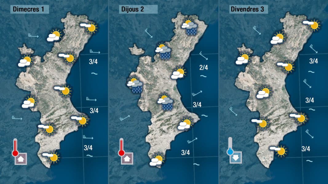 Jueves, a pesar de estar el cielo más nublado y llover un poco por la tarde, las temperaturas todavía subirán un poco más, y viernes el mistral dejará el ambiente más fresco y nuevo.