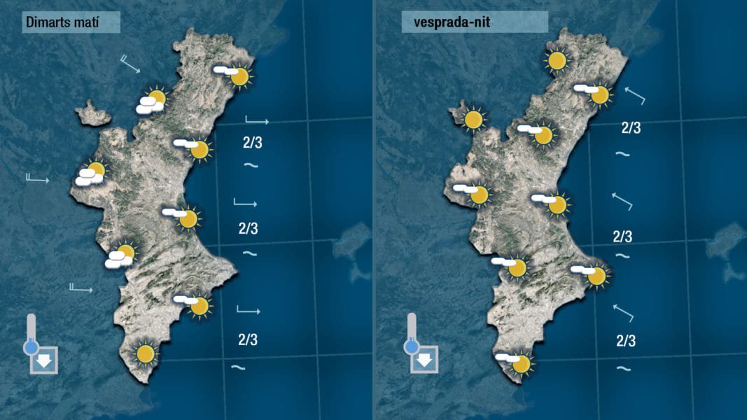 Y como las últimas semanas, el comportamiento de las temperaturas estará condicionado por la dirección del viento, que un día soplará más puro de poniente y otros más del norte (mistral) y el otro más del sur (lebeche), y de lluvia para la semana que hoy empieza poca o nada.