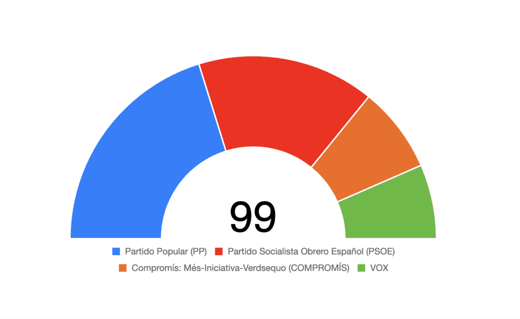 Resultados de las elecciones autonómicas de 2023 en cantidad de votos, porcentaje y cantidad de escaños de representación en les Corts Valencianes