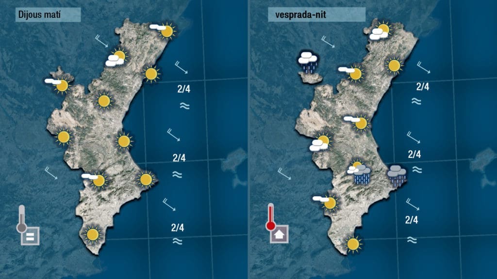 Mañana jueves el mistral será el encargado de hacer correr las nubes hacia el sudeste en la hora que hace bajar la concentración de polvo a la atmósfera. Día claro y asoleado con de nubes que por la tarde se harán más abundantes e incluso podrán dejar algún chubasco débil tanto en el interior de València como las comarcas que separan València y Alicante.