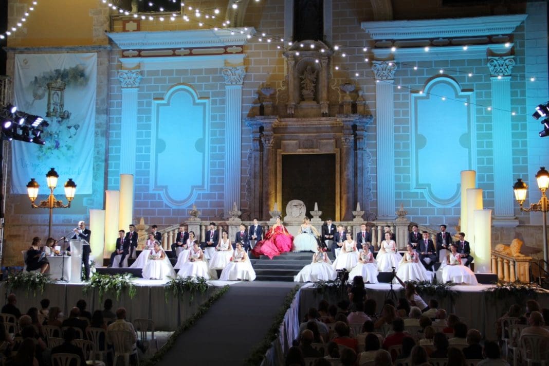 Finalizada la sesión plenaria, Boro Peiró daba inicio al solemne acto de Presentación, y en el cual Sofia Marta Puerta recibía de su antecesora en el cargo, Sofía Segarra, la caramba y la corona que la acreditan como la Reina de las Fiestas 2021. Todo ello bajo el espectacular juego de luces que se proyectaba sobre la fachada de la Iglesia y al son de las 21 salvas para proclamar a la nueva reina de las fiestas.