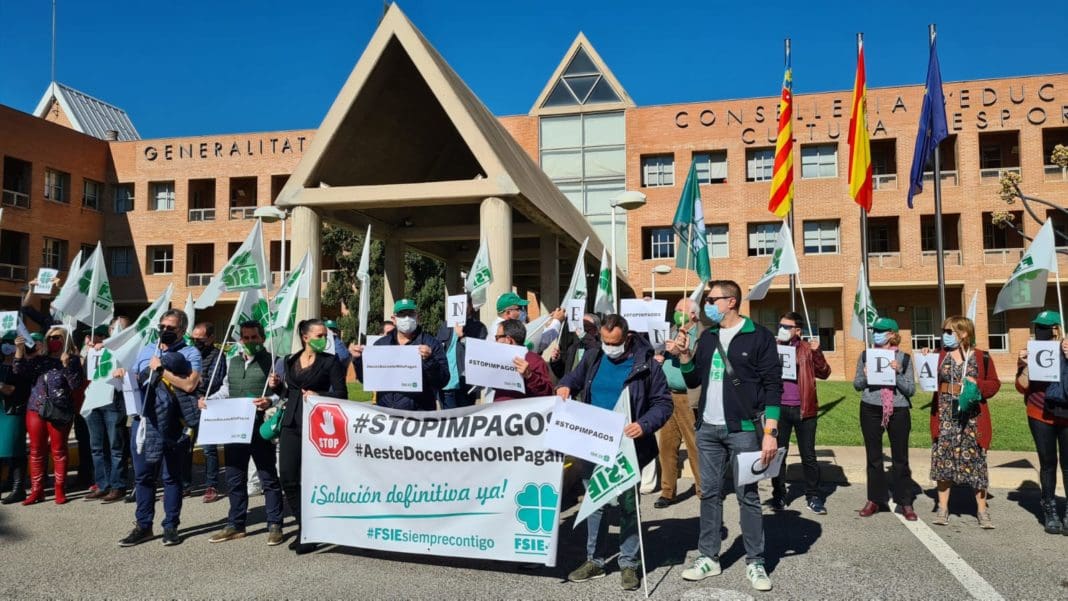 Bajo las proclamas «Queremos cobrar», «A este docente, no le pagan» o «Stop impagos», decenas de docentes han exigido a las puertas de la conselleria una solución para poner fin «inmediatamente» a los impagos porque algunos no han cobrado su salario en seis meses. «Exigimos el abono inmediato de las cantidades adeudadas y el compromiso ‘firme’ por parte del Consell de encontrar una solución permanente para que esta situación deje de repetirse cada curso» manifiestan desde el sindicato.