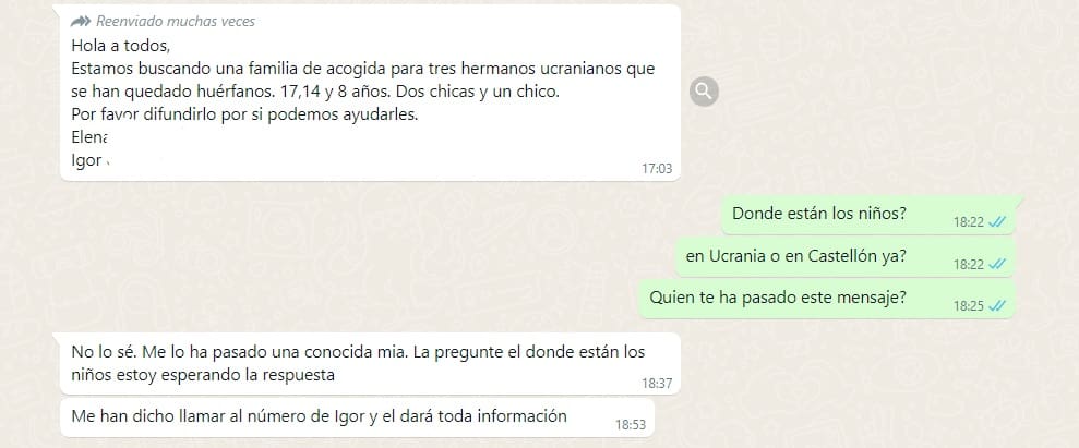 Al cabo de una rato, a través de los móviles con los que hemos intentado contactar con las supuestas personas que están buscando hogar para estos 0huérfamos de la guerra’, recibimos un escueto mensaje sin que nos hayan respondido a ninguna de nuestras preguntas respecto los menores indicando que ya tienen hogar. Lo que queda por saber es qué uso se dará a hora a todos los números que se han interesado.