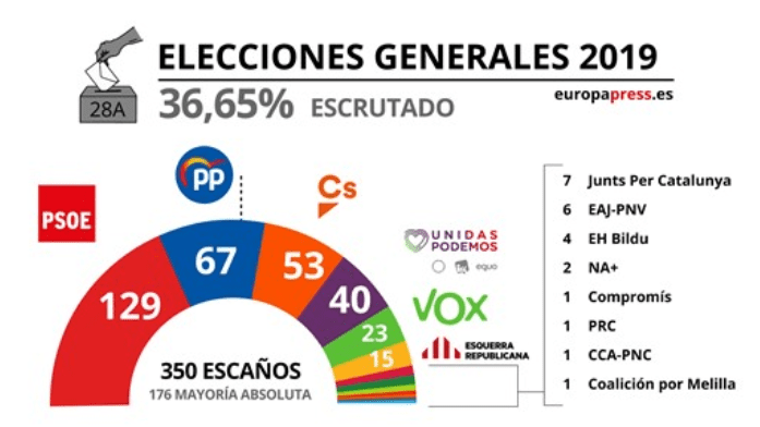 Més de 36,8 milions d’espanyols estaven cridats a les urnes aquest diumenge 28 d’abril per a triar als seus representants en les Corts Generals, 208 senadors i 350 diputats, la qual cosa suposa quasi 400.000 d’electors més que en els comicis generals de juny de 2016.