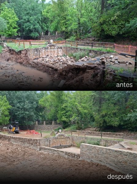 Por otro lado, se ha estado trabajando en la reparación de los senderos de gran recorrido (GR 7 y GR 10) y el Camino Natural del Turia-Cabriel -a su paso por la provincia de Valencia-, en los que se produjeron arrastres, aterramientos y cárcavas en el firme, daños en la señalización (postes, paletas, balizas, paneles informativos y desaparición de las marcas de pintura), principalmente en los cruces de ríos, ramblas y barrancos. Cabe destacar la desaparición del puente colgante sobre el río Turia en Benagéber.
