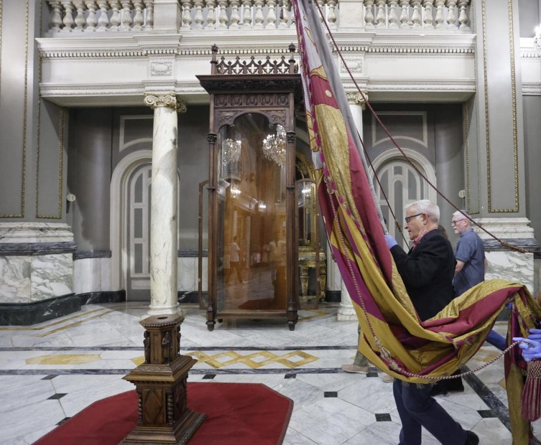 La Real Senyera, que desde hace 94 años custodia el Museo Histórico Municipal, se exhibe en el Salón de Cristal, desde hoy y hasta que finalicen las obras de renovación integral del mencionado museo.