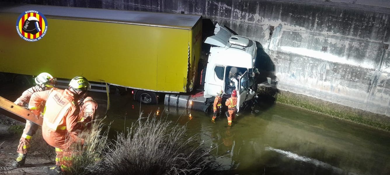 Efectivos del Consorcio Provincial de Bomberos de Valencia han rescatado en la madrugada de este sábado al conductor de un camión tras caerse en una acequia entre los términos de Gavarda y Alberic.