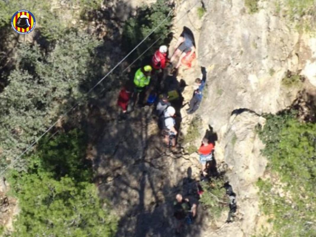 El grupo de rescate de altura GERA de los bomberos han rescatado este mediodía a un hombre que ha sufrido un accidente en una zona montañosa de Enguera. El herido se encontraba haciendo la Vía Ferrata de Godalla cuando se ha lesionado el pie mientras pasaba por una zona con tirolina.